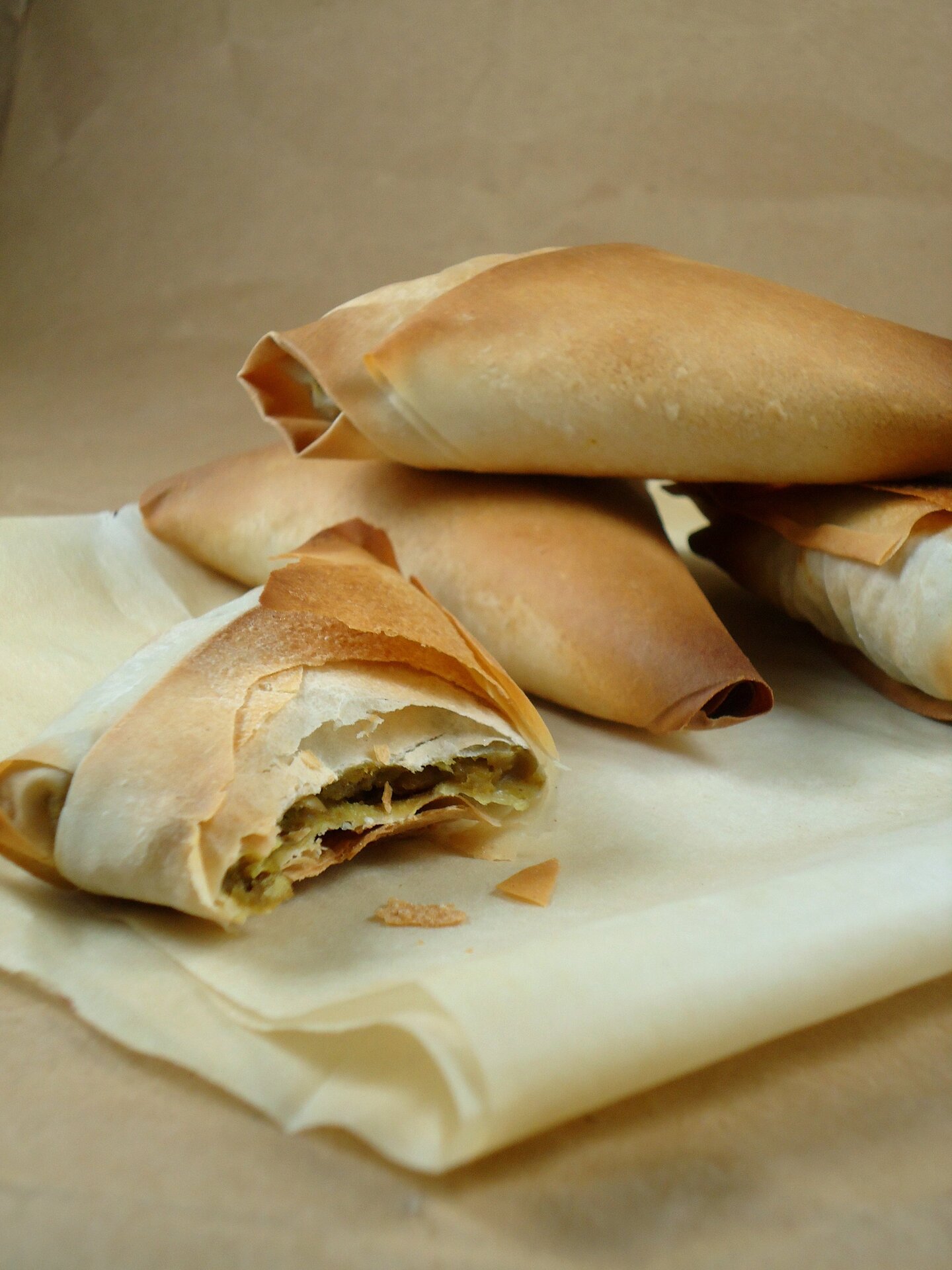 - Molham-se as bordas com clara de ovo, dobram-se em triângulos e fritam-se em óleo quente até ficarem douradas.