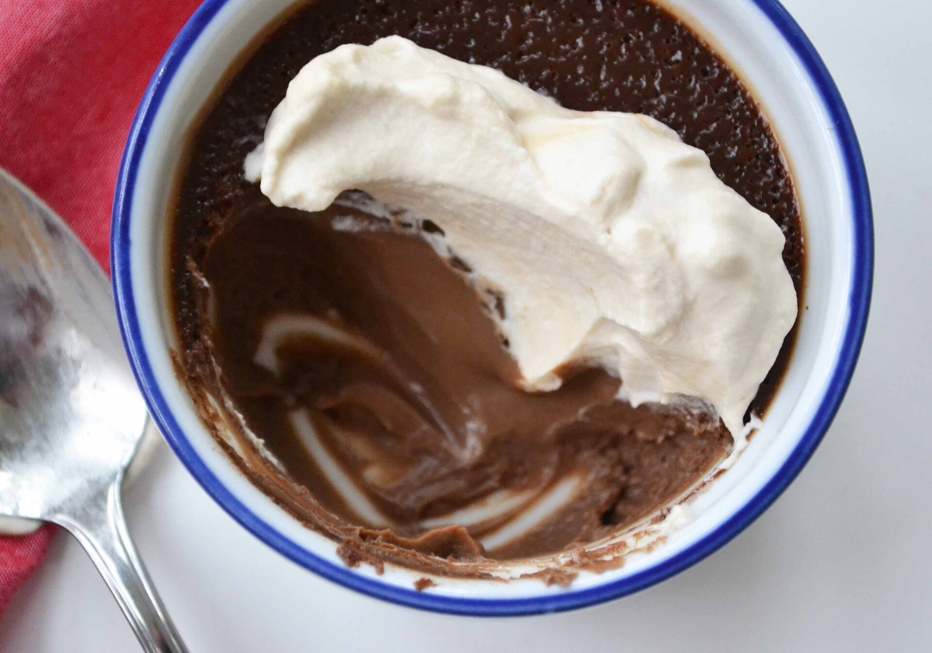 - Põem-se a ferver as natas com o leite e deitam-se sobre o chocolate em pedaços. Mistura-se tudo muito bem com umas varas e deixa-se arrefecer um pouco. Deita-se então a manteiga (que deve estar numa consistência de pomada) e o ovo previamente batido. Misturar tudo com muito cuidado por forma a obter uma preparação bem lisa. Reparte-se este creme por 6 tigelas (que possam ir ao forno) e dispõem-se no centro algumas avelãs caramelizadas. Este creme vai então a cozer durante 30 min. em forno de 90º e deve servir-se morno ou frio com uma bola de gelado praliné.
