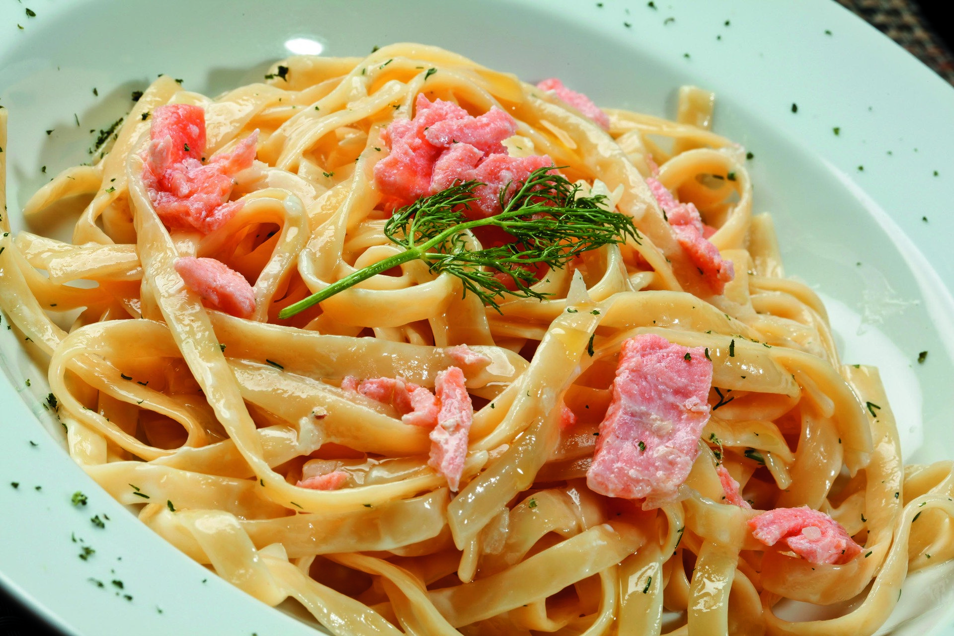 - Corte o salmão fumado em pedaços do tamanho que quiser e tempere com sumo de limão e pimenta, de preferência preta e acabada de moer. Depois da massa cozida escorra-a e ponha-a no recipiente em que a vai servir. Adicione o iogurte ou as natas ao tomate e tempere com uma pitada de ervas aromáticas a seu gosto. Depois de retomar fervura, junte o salmão e deite tudo sobre a massa. Enfeite com alcaparras a gosto e sirva logo. Se quiser, polvilhe com um pouco de queijo ralado.