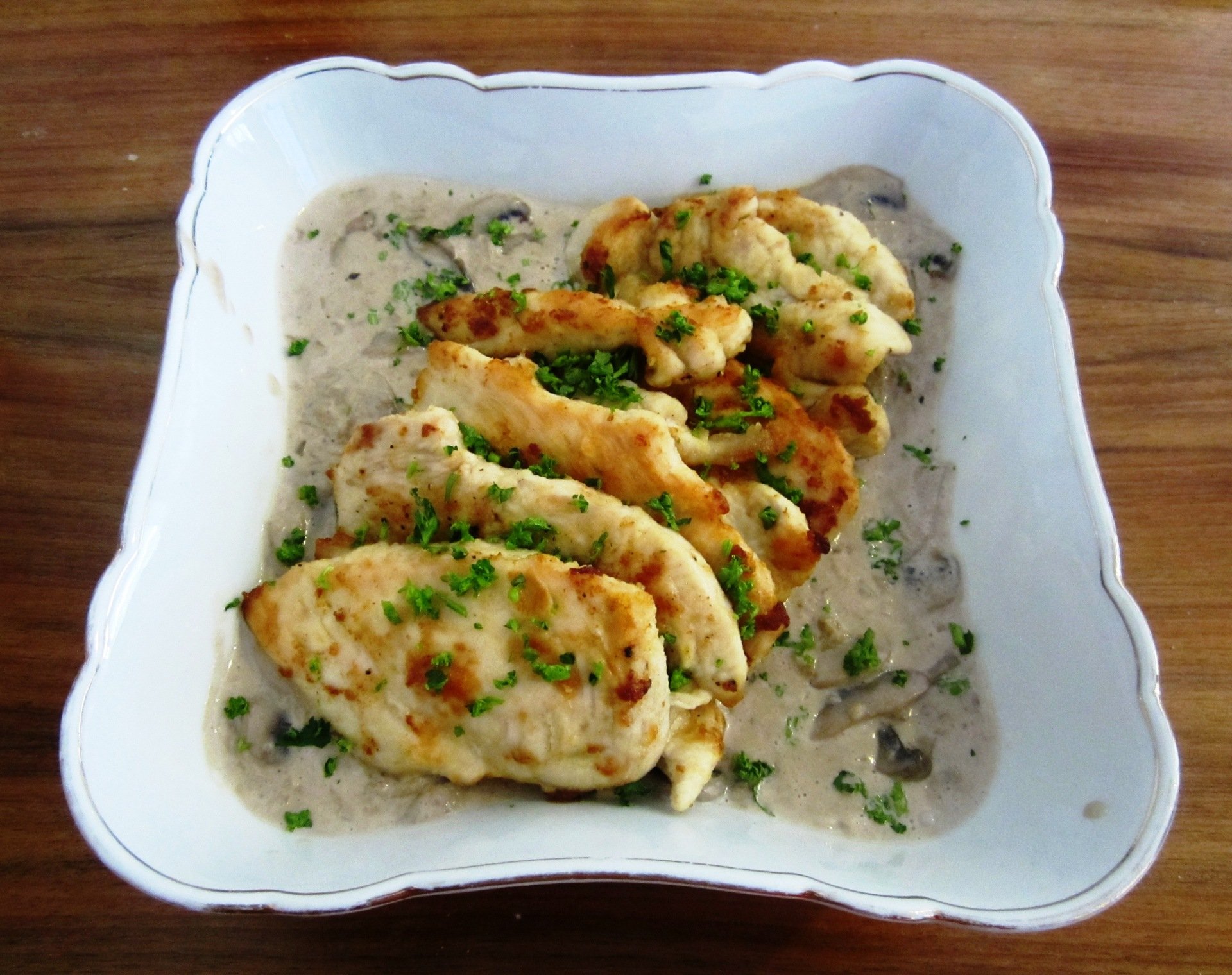 - Tempere os peitos de frango com sal e pimenta, e salteie-os na manteiga em lume brando. Retire-os e reserve. Na mesma gordura refogue ligeiramente os cogumelos cortados às lâminas. Adicione a farinha, doure-a e junte 0,5 lt de água. Coza em lume vivo durante 10 minutos. Agregue o leite em pó ao molho e passe-o com a varinha mágica até obter um molho fino. Tempere com sal, pimenta e noz-moscada, e verta-o sobre a carne cortada. Sirva preferencialmente com arroz branco.