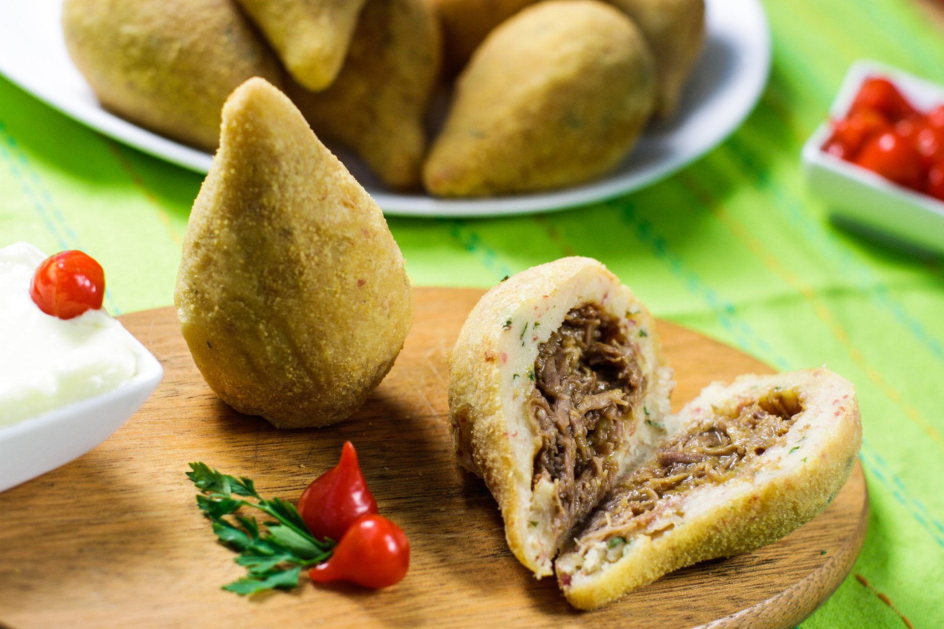 - desfiado e refogado, com o recheio). Passe as coxinhas na água, na farinha de