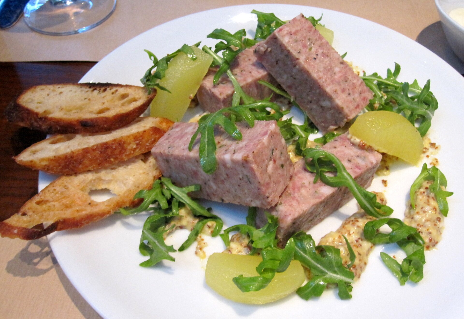- Junte a carne de porco, de vaca, o fígado de galinha e os toucinhos e passe-os, novamente, pela máquina de moer carne, usando a parte mais fina. Misture bem, tempere com sal, pimenta, tomilho e noz-moscada, amassando bem. junte o pão, levemente amolecido em um pouco de água. Aqueça o óleo em uma panela, frite a cebola por 2 minutos, junte o alho e frite por mais 1 minuto. Coloque a carne e refogue-a, cerca de 10 minutos, mexendo sempre. Junte o conhaque e flambe. Retire do fogo e espere esfriar um pouco. Na batedeira, bata o creme de leite até ficar cremoso. Misture-o à carne refogada, junto com a manteiga amolecida. Bata bem até ficar homogêneo. Unte uma fôrma de patê com manteiga e despeje a massa. Leve ao freezer por um dia. Remova para a geladeira 2 horas antes de servir.