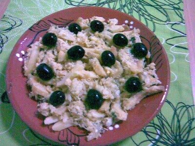 - Refogue a cebola e os alhos ás fatias finas na margarina.Junte as batatas , as salsichas ás rodelas e as delícias do mar desfiadas.