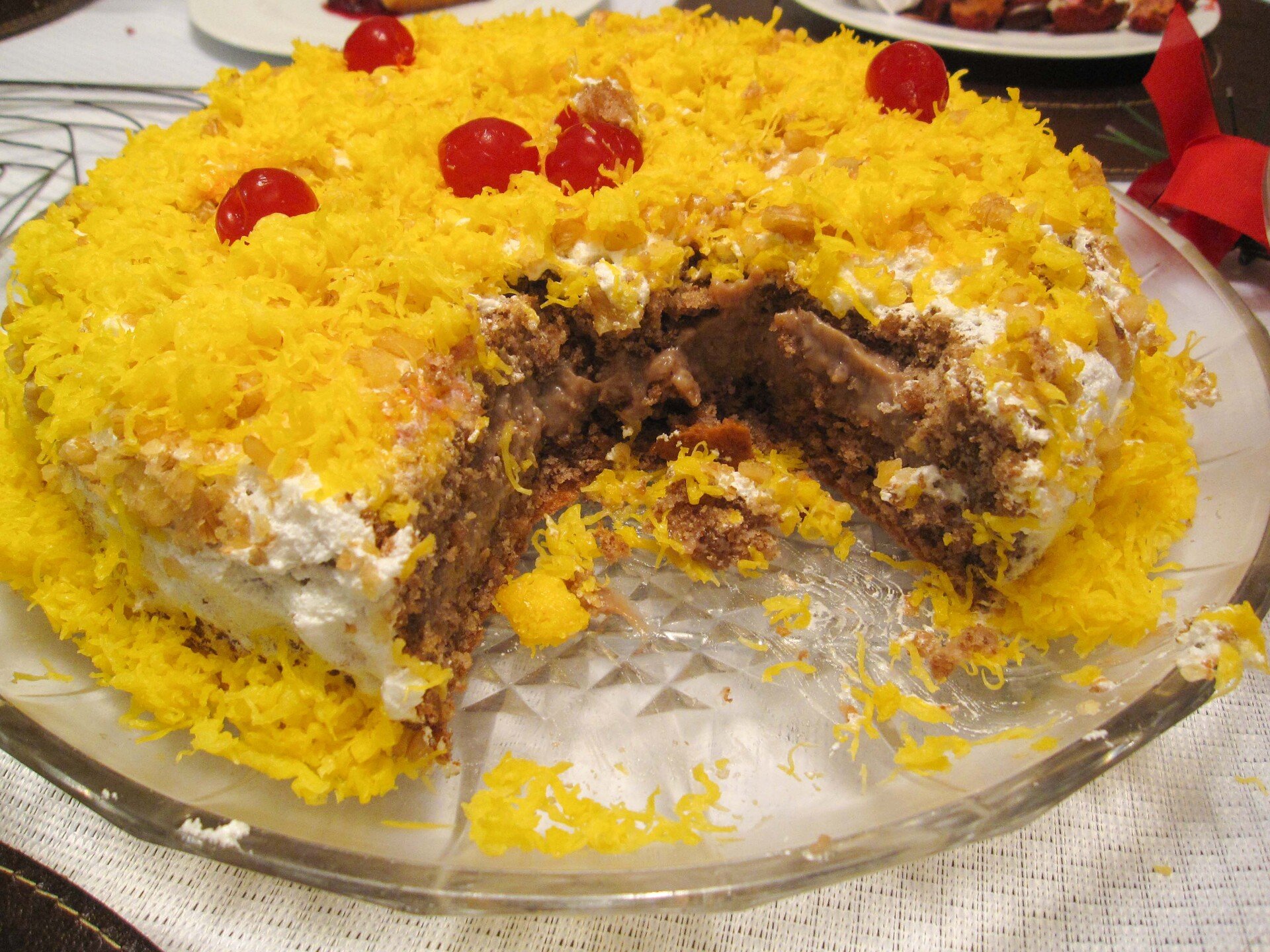 - Faça um pão-de-ló de 6 ovos, forma n.º 2, acrescentando à massa 8 CS de nozes moídas e 6 CS de farinha de rosca, em lugar da farinha de trigo. Reserve. Recheio: leve ao fogo: 1 copo de calda grossa previamente preparada (veja receita), ½ vidro de leite de coco, 1 gema e 1 kg de nozes (pesadas com casca) moídas de que já se retiraram as 8 CS que foram utilizadas na massa do pão-de-ló. Recheie e cubra com essa pasta e decore com algumas nozes inteiras.