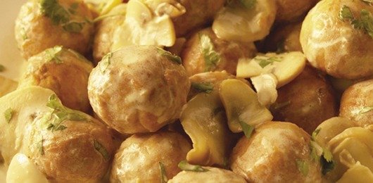 - Aqueça o azeite e a manteiga numa frigideira anti-aderente, junte as almôndegas e frite-as,agitando a frigideira, até estarem douradas.