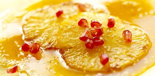 - fundo e repita as operações até terminar as fatias de ananás. Deite o retante açúcar na frigideira, junte o sumo de laranja e o pau de canela e deixe ferver suavemente até reduzir um pouco. Entretanto abra a romã e separe os bagos.