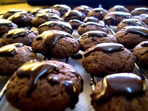 - Parta o chocolate em quadradinhos e leve a derretar com as natas, durante 1 minuto na potência máxima do microndas. Se não tiver microndas, aqueça primeiro as natas sobre lume brando e junte depois o chocolate em quadradinhos. Mexa com uma vara de arames até a mistura estar lisa e homogénea. Deite esta mistura em fio sobre as bolachinhas enfeitando a superfície como quiser.