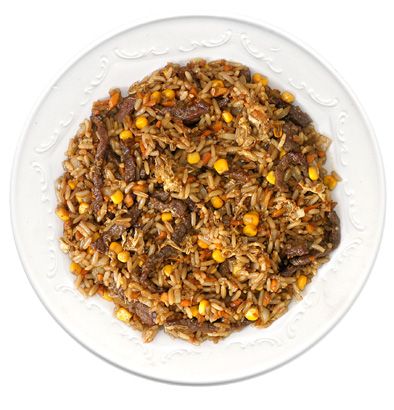 - Aqueça o óleo numa frigideira, junte o arroz cozido e as amêndoas de cajú. Regue com o molho de soja. Acrescente lentamente o ovo batido, mexendo sempre. Frite até que o ovo esteja dourado.