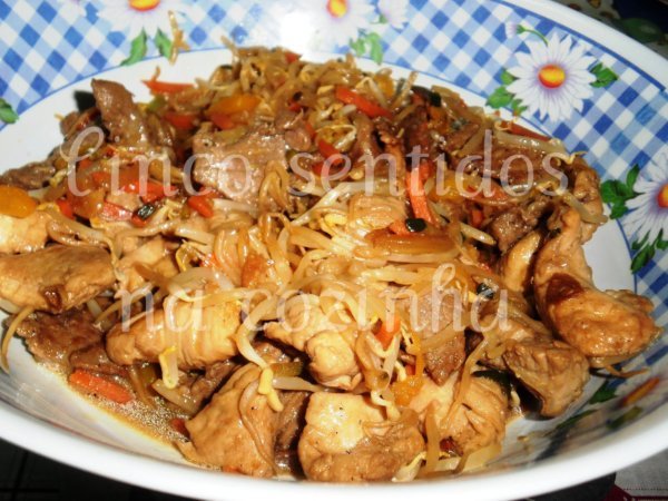 - Depois de demolhado, escalda-se o bacalhau, tiram-se-lhe a pele e as espinhas e desfia-se. Cortam-se as cebolas em rodelas finas e as batatas em palitos. Frita-se o alho no azeite até alourar, depois tira-se, deitam-se as batatas e fregem-se ligeiramente, retirando-as para o lado com uma espátula. No mesmo azeite, fritam-se depois as cebolas até corarem, retirando-as também com a espátula, e depois o bacalhau, até enrijar um pouco. Mistura-se tudo muito bem e retira-se do lume. Batem-se os ovos temperando-os com sal e pimenta e juntando-os ao preparado. Leva-se de novo ao lume, mexendo-se constantemente com uma espátula até os ovos coagularem, mas de modo a ficarem macios. Serve-se de imediato numa travessa aquecida, polvilhando com a salsa picada.
