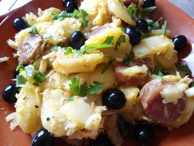 - Sobre este preparado coloca-se o bacalhau em pequenas postas e as batatas cruas e cortadas às rodelas ou aos pauzinhos. Repete-se o processo em camadas sucessivas até à altura que se desejar. Por cima deita-se um pouco de vinagre fino. O tacho deve conservar-se sempre fechado.