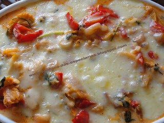 - Deixe o bacalhau de molho por 24 horas mudando frequentemente a água. Escalde numa rápida fervura removendo peles e espinhas. Coe a água onde o bacalhau foi cozido e reserve. Separe o bacalhau em lascas pequenas e tempere com alho, sal e coentros e reserve. Coloque uma caçarola no lume com azeite e as cebolas em rodelas e o alho, deixe as cebolas ficarem transparentes e adicione os tomates sem pele e sem sementes, o pimento e as azeitonas picadas. Junte o bacalhau, o extrato de tomate, o leite de coco e a água onde foi cozido o bacalhau. Descasque as batatas, raspe as cenouras, corte tudo em rodelas e cozinhe em água com pouco sal. Coloque no liquidificador, o leite, a farinha de trigo e a manteiga, coloque numa panelinha e leve ao lume, mexendo bem, até ficar com a consistencia de um creme. Junte as natas, tire do lume, junte os ovos e tempere com a noz moscada, o sal e a pimenta. Unte um pirex grande com azeite depois de ter esfregado por dentro dele um dente de alho. Disponha em camadas alternando o bacalhau, a batata e a cenoura. Cubra tudo com molho e leve ao forno a gratinar. Ao sair do forno, enfeite com azeitonas e salsa. Sirva com arroz branco.