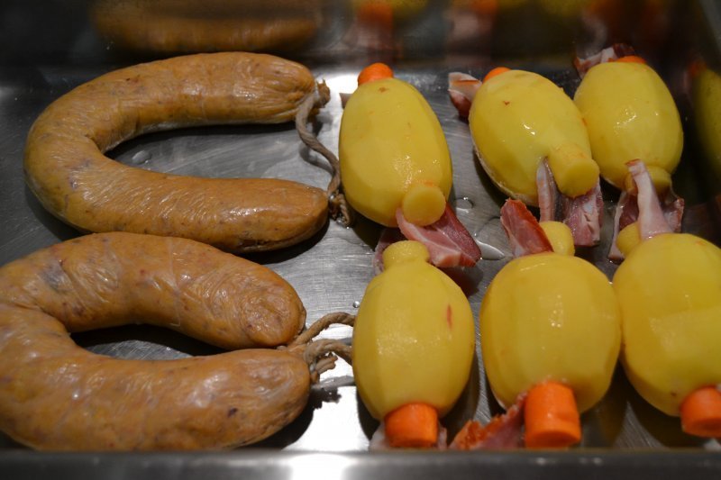 - Coze-se o bacalhau e à parte as batatas e as couves. Reserve cerca de 1l de água do bacalhau. Corte o pão em fatias, coloque-as no fundo do recipiente de barro e espalhe por cima os alhos picados; regue com a água quente do bacalhau e tempere com azeite. Por cima, coloque o bacalhau, as couves e as batatas. Tempere de novo com azeite, alhos e vinagre e arranje com as metades dos ovos cozidos.