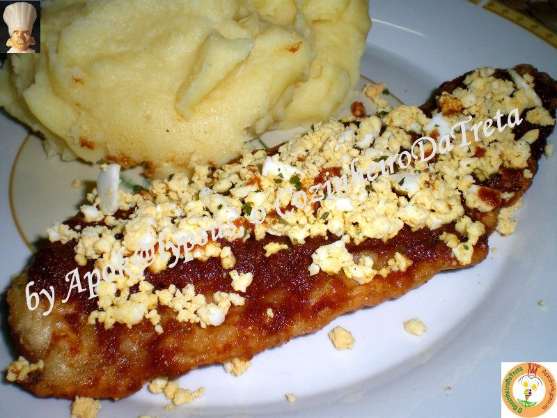 - Coze-se o bacalhau, limpa-se de pele e de espinhas, envolve-se em farinha de trigo, molha-se em ovo batido e frigi-se em bom azeite, no qual também se frigem rodas de batatas.