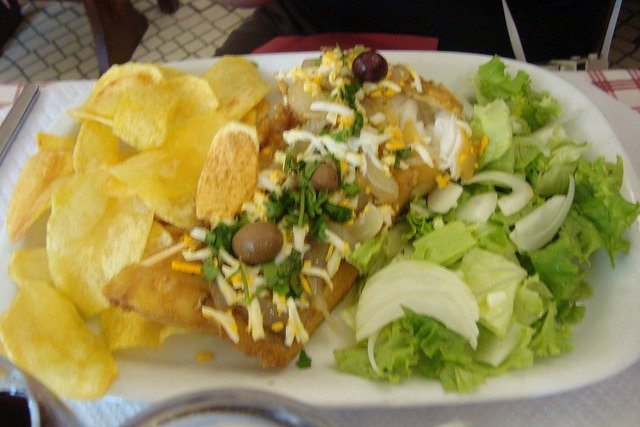 - Coloque as postas de bacalhau e as batatas numa travessa de serviço e cubra com a cebolada. Enfeite com azeitonas e acompanhe com o esparregado, ou grelos salteados.
