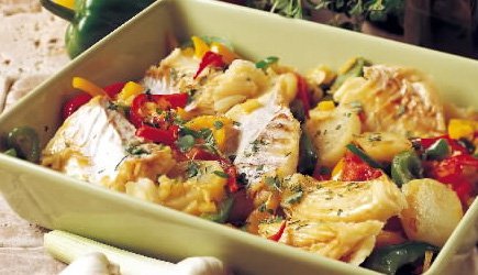 - Untar uma forma com duas colheres (sopa) de azeite e arrumar camadas alternadas de bacalhau, batata em rodelas, o tomate em cubos e os 3 tipos de pimentão.