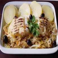- 500 g de lombo de bacalhau, cortado em postas, demolhado por 24 horas, folhas de couve 1 cebola grande picada ½ xícara de azeite 600 g de batata cozida.