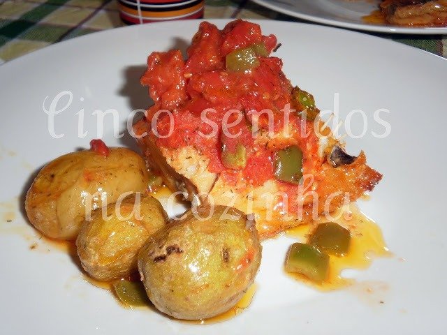 - Num tabuleiro de ir ao forno, coloque a cebola, as batatas e o tomate. Polvilhe com salsa.