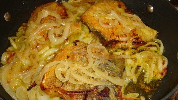 - Arrumar o bacalhau numa travessa e colocar a cebolada por cima.