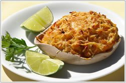 - Arrume as berinjelas recheadas, espalhe uns pedacinhos de manteiga e polvilhe tudo com o queijo parmesão ralado.