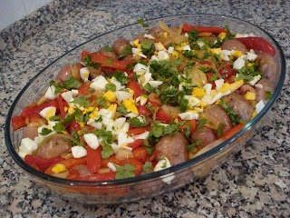 - Deixar refogar em, lume brando, antes de apagar o fogão envolver grosseiramente o atum bem escorrido e os camarões aos pedaços, apagar o lume.