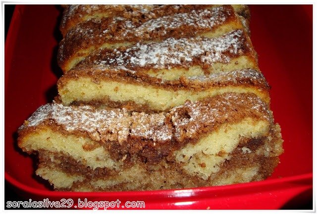 - Numa forma de bolo inglês grande, bem untada com manteiga, vão-se deitando camadas irregulares de massa branca e massa escura, começando e acabando com a massa branca.