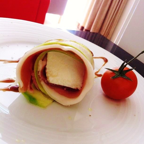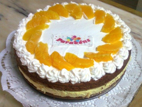 - Coloque uma porção de bolo sobre um prato e acrescente metade do recheio de laranja. Espalhe o recheio por toda a superfície do bolo.