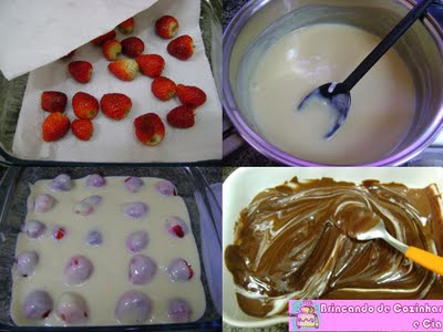 - Coloque o leite condensado e a manteiga e leve ao lume mexendo sempre até começar a soltar do fundo da panela. Reserve este creme no pirex. Deixe esfriar e coloque os morangos por cima. Derreta em banho-maria o chocolate e misture o creme de leite e coloque por cima dos morangos. Leve à geladeira. Obs: Os morangos podem ser substituídos por uva.