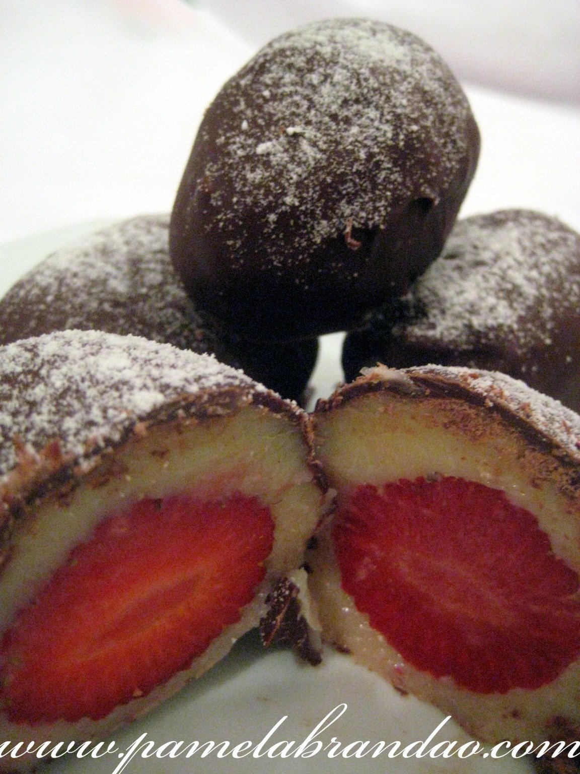 - Forre forminhas de bombom com chocolate ao leite para cobertura, e coloque o recheio de morango, cubra com chocolate o fundo e leve a geladeira até endurecer o chocolate.