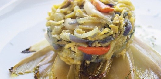 - Disponha as endívias abertas sobre os pratos de serviço e sobre elas coloque o bràs de vieiras, enformado com a ajuda de um aro metálico.