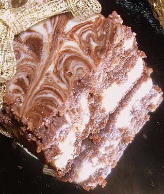 - Deite a massa de chocolate no tabuleiro, e por cima deite delicadamente a massa de ricotta. Com os dentes de um garfo ou com dois palitos de madeira, faça movimentos circulares sobre a massa de forma a provocar o efeito marmoreado.