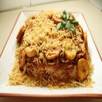 - Espalhe num pirex um pouco de molho de tomate, depois coloque uma camada de arroz, um pouco de queijo e de carne moída e, por último, a banana. Repita a operação, sendo que a última camada deve ser de queijo. Polvilhe com o parmesão. Cubra com papel-alumínio e leve ao forno até derreter o queijo. Sirva como prato único.