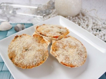 - Recheie as casquinhas com a mistura preparada. Polvilhe com a farinha de rosca e por cima distribua os pedacinhos de manteiga.