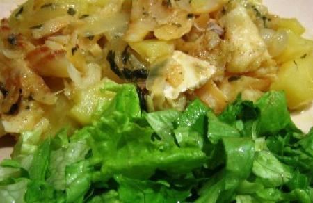 - Deite um pouco de azeite na cataplana e disponha camadas de cebolas, batatas, pimentos e tomate.