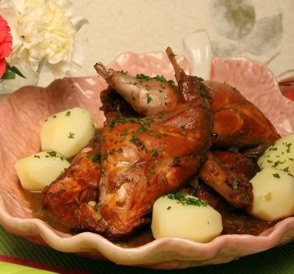 - Junte as batatinhas e o mel ao coelho, deixe ferver até as batatas ficarem cozidas, rectifique de temperos e sirva.