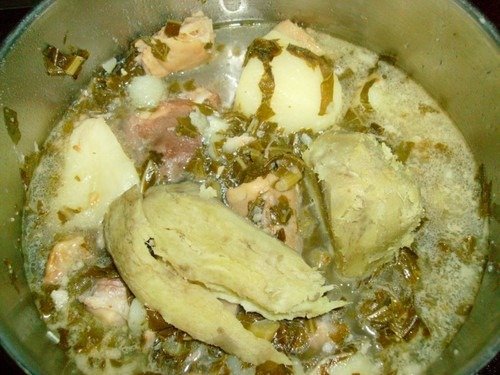- Na restante agua coza couves picadas (corte 2 a 3 vezes mais grossas que a do caldo verde), batatas brancas, batatas doces, 1 cebola e 2 dentes de alho. Quando tiver cozido junte as carnes. (aldrabo 1 pouco e junto 1 caldo de galinha).Este prato é uma sopa mas ao mesmo tempo um prato principal. Normalmente aqui come-se num prato de sopa e com um garfo vai-se comendo as carnes e a batata e ao mesmo tempo com uma colher bebendo o caldo. (confuso , acho que sim, mas para mim resulta na perfeição). acompanha-se com pão de milho.