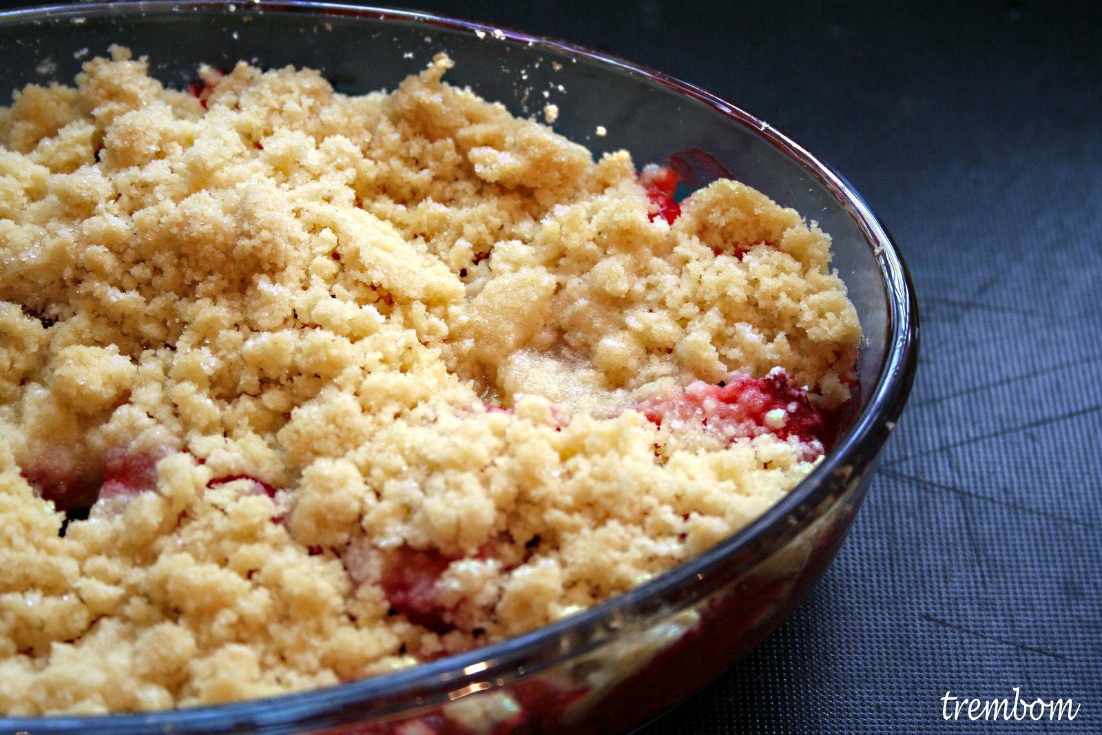 - Numa tijela á parte adicione a manteiga amolecida, a farinha e o açucar, misture com a ponta dos dedos, até obter uma massa granulada, colocar esta massa por cima dos morangos e levar ao forno pré-aquecido a 180º por cerca de 30 minutos, ou até dourar por cima.