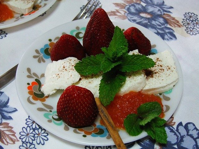 - Entretanto bata as natas com o açúcar até estarem bem firmes. Disponha uma "colherada" por cima do doce (já frio e distribuído pelas taças) e polvilhe novamente com canela.
