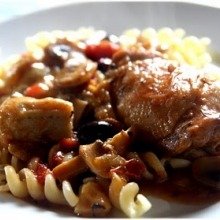 - Corte o frango em quatro e tire-lhe a pele e as gorduras. Aqueça o azeite e junte o frango e as cebolas picadas. Deixe alourar 5 a 10 minutos. Adicione uma pitada de mistura de ervas, a paprika , o caldo de galinha, o tomate pelado e sem sementes e os cogumelos cortados em lâminas. Tempere com o sal e pimenta, deixe levantar fervura e deixe cozer durante cerca de 30 minutos. Disponha os quartos de frango no prato de serviço. Dissolva a farinha em duas colheres de sobremesa de água e junte ao molho. Deixe cozer e deite sobre o frango. Sirva enfeitado com agriões e acompanhe com esparguete cozido.