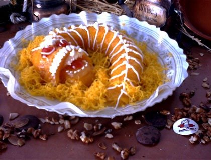- Coloque ½ pêra cristalizada no sítio da boca e 2 cerejas cristalizadas no sítio dos olhos. Decore com a clara batida em castelo com 100 g de açúcar passados pelo saco de pasteleiro munido de um bico liso e fino. À volta disponha mais fios de ovos e fruta cristalizada.
