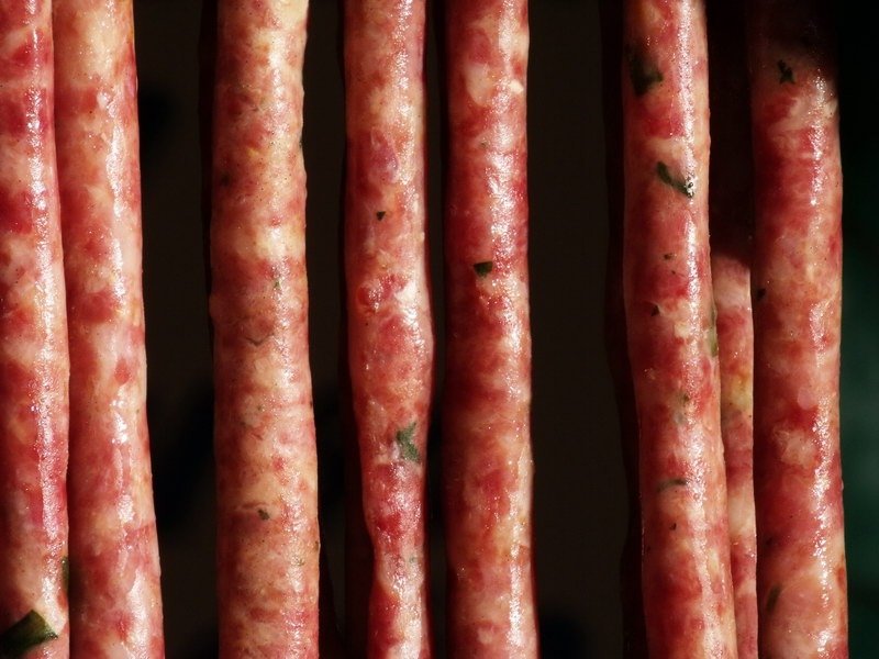 - Coloque a água e o vinagre em uma tigela e deixe as tripas de molho por 30 minutos. Retire e lave-as em água corrente, por dentro e por fora, colocando a abertura da tripa no bico de uma torneira. Pendure e deixe escorrer. Corte a carne e o toucinho em pedaços pequenos, tempere com sal, pimenta, alho e cheiro-verde, misture bem. Deixe repousar por 06 horas, mexendo de vez em quando para ficar bem temperada. Encha as tripas com a mistura de carne e toucinho com funil próprio e faça alguns furinhos para soltar líquido e ar. Pendure em local longe de moscas por duas ou três horas. Conserve no refrigerador por dois dias ou no freezer por até dois meses.