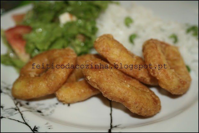 - Passado este tempo, enxugue as lulas (argolas e cabeças), passe-as por farinha e em seguida pelo ovo batido com o azeite, sal e pimenta.