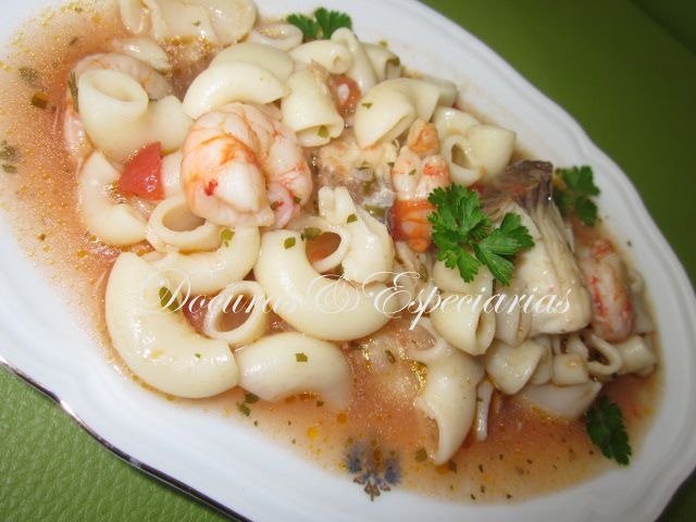 - Por fim, junte o macarrão, (se necessário acrescente mais um pouco de água e rectifique os temperos) o camarão e as delicias do mar e deixa-se cozer cerca de 12 minutos.