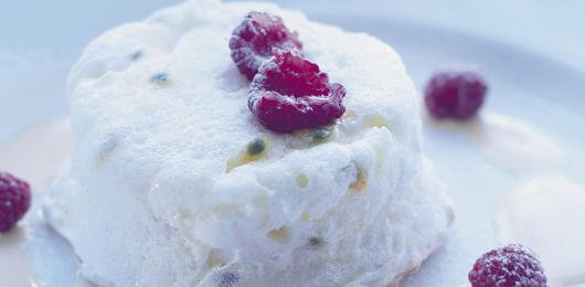 - Decore os merengues com as framboesas e sirva com o sabayon em redor. Polvilhe com açúcar em pó.