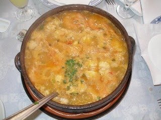 - Deitam-se num tacho 2,5 litros de água, à qual se junta o bacalhau demolhado sem peles e sem espinhas e partido em bocadinhos, e as batatas descascadas e cortadas em quadradinhos.