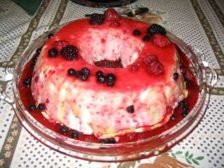 - Retire do forno, desenforme para um prato largo, deixe arrefecer, regue com o doce e sirva decorado a gosto, por exemplo mais frutos silvestres inteiros e hortelã.