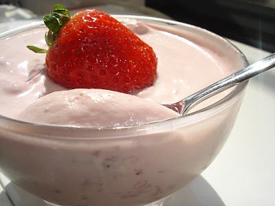 - Bata as natas com 70 g de açúcar até estarem bem espessas. Junte a gelatina previamente escorrida e derretida na água a ferver. Misture com o puré de morangos e deite em tacinhas. Leve o frigorífico para refrescar.