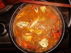 - Após estar pronto este pirão, retorne com os siris partidos para a panela.