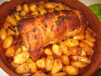- Coloque a peça de carne numa tigela ou alguidar. Tempere de sal e junte os grãos de pimenta preta. Regue com o vinho branco seco. Junte a folha de louro, o raminho do tomilho e o açafrão. Tape e deixe em repouso, dentro do refrigerador por vinte e quatro horas. No dia seguinte retire a peça de carne da marinada e coloque numa assadeira. Regue com um fio de azeite. Distribua nozes de banha sobre a carne. Leve ao fomo, a uma temperatura de l8OºC, até que a carne esteja macia. De vez em quando pode ir regando a carne com um pouco do líquido da marinada. Fatie a carne e sirva com batata no forno.