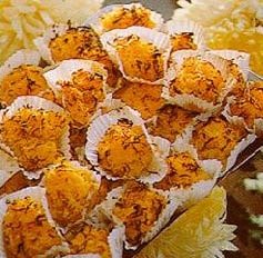 - Cortam-se umas rodelas de hóstia com 5 cm de diâmetro, coloca-se sobre esta 1 colher de chá de massa de ovos e cobre-se com fios de ovos.