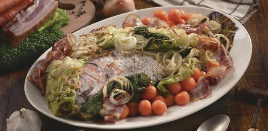 - Lave e enxugue muito bem o pargo depois de devidamente amanhado e escamado e coloque-o no centro do rectângulo de couves. Descasque as cebolas, pique uma delas e misture-a com metade do bacon igualmente picadinho. Introduza a mistura na barriga do pargo e prenda com um palito. Tempere o peixe com sal e envolva-o na couve de modo a ficar completamente tapado. Coloque-o sobre um tabuleiro de forno, por cima espalhe a restante cebola cortada em rodelas e o restante baconem tiras. Tempere com sal e pimenta para bife, regue com o vinho branco e com o cubo de caldo de peixe dissolvido naágua quente. Por cima espalhe metade da margarina Vaqueiro em nozinhas, tape com papel de alumínio e leve a cozinhar em forno moderado durante cerca de 40 minutos, retire a folha de alumínio ao fim de 30 minutos. Coloque o peixe na travessa de serviço e mantenha quente. Leve o molho a ferver sobre lume forte até reduzir um pouco. Adicione a restante margarina vaqueiro, misture bem.